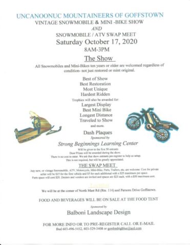 The Goffstown show and swap will be held on Saturday October 17, 2020. The town of Goffstown has agreed to let us hold the show this year, all state regulations at the time must be adhered to. All snowmobiles and mini-bikes are welcome to show, regardless of condition ( there's an award for the hardest ridden), and there will be plenty of swap space if you have something to sell. There is no charge to show, and swap spaces are $20.