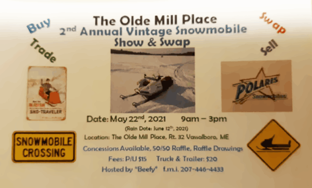 Search for: Advanced Search Place Ad Edit Ad Browse Ads Search Ads The Olde Mill Place 2nd Annual Vintage Snowmobile Show and SwapClick to enlarge image.Contact InformationContact BeefyPhone: 207-446-4433 Price: Free More InformationThe Old Mill Place 2nd Annual Vintage Snowmobile Show and Swap May 22, 2021. SATURDAY 9am - 3pm FMI call Beefy @. 207-446-4433 This Ad has been viewed 280 times.
