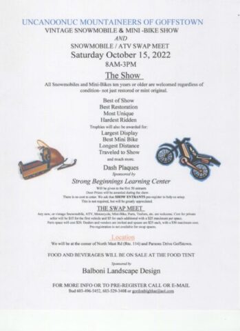 The Uncanoonuc Mountaineers of Goffstown Snowmobile Club is holding our annual vintage snowmobile & mini-bike show on Saturday October 15th, 2022 from 8am - 3pm. Any snowmobiles or mini-bikes 10 years or older are welcome to enter the show and there is no charge for showing. Trophies will be awarded in over twenty classes and door prizes will be handed out as well. Dash plaques will be given to the first 20 entrants.