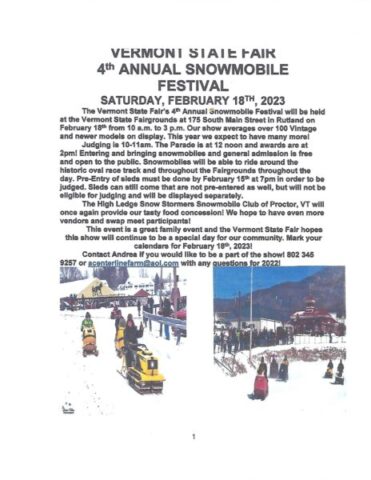 Posting for the event, details and flyer are on Facebook under "Vermont State Fair" and the page will come up. February 18, 2023 at the Fairgrounds right on US. Rte. 7. Pre-entry for sleds to be judged must be in by February 15th. Non judged sleds are welcome. 7?10 mile oval track on site.