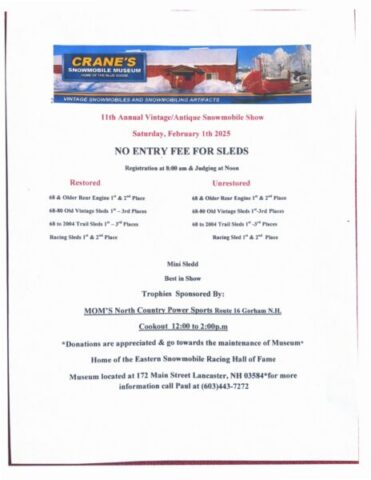 Search for: Advanced Search Place Ad Edit Ad Browse Ads Search Ads Crane's Annual Antique Snowmobile ShowClick to enlarge image.Contact InformationContact Paul CranePhone: 603-443-7272 Price: $ 1,234.00 More InformationCrane's snowmobile show, Saturday February 1st. 172 Main St., Lancaster, NH 03584. See the attached flyer for more information. This Ad has been viewed 130 times.