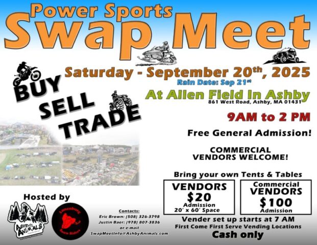 Lunenburg(MA) Snowriders & Ashby Animals Annual Power Sports Swap 9/20/2025 (rain date 9/21). The location is Allen Field (861 West Rd) in Ashby, MA. Vendor Set-Up starts at 7am. General Admission is 9am-2pm. This is a CASH ONLY event. Contact us via email for more information about Gold ($200) and Silver ($100) Sponsorships opportunities.