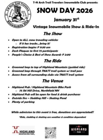 The second annual SNOW DAY presented by T-N Arch Trail Travelers @ Highland Mountain-75 Ski Hill Drive, Northfield NH. Don't miss the event everyone is still talking about from last year! Open to all snow traveling vehicles. Incredible venue, incredible machines with incredible people. Come join us for the fun on January 31st. Registration starts at 9:30 am. Dash plaques to the first 75 participants, Best of Show & People's Choice awards. Admission to this event is FREE, though donations are appreciated. Highland pub will be open for food & drink. See attached flyer for more information. #tnattsnowday