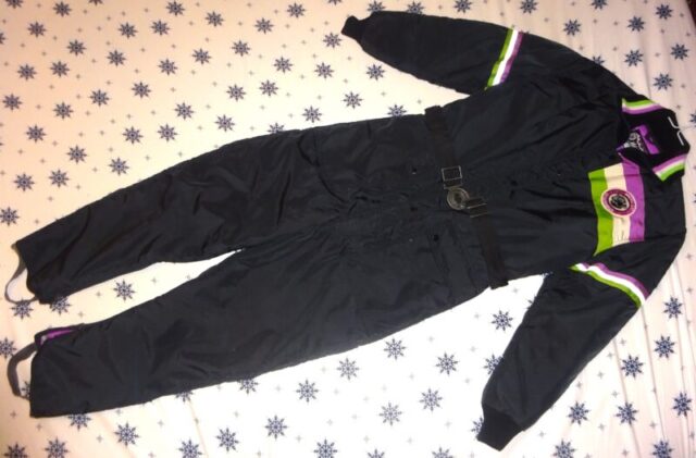 Vintage Arctic Cat Snowmobile Suit. Size Large. Excellent condition except the Arctic Cat half of the belt buckle is broken and missing. The material feels like new, and the colors are crisp and bright. Zippers and snaps function properly, and there are no stains. The foot straps are intact and slightly elasticized. Professionally cleaned and has been stored inside my no-smoking, no pets, humidity-controlled home. $85.00 plus shipping if applicable. I have nine separate Vintage Arctic Cat clothing items for sale on this site, so if you want to buy two or more items, I’m willing to work out a package price. I can be contacted by email: wookie_9876@yahoo.com. That is wookie(underscore)9876@yahoo.com.